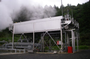 写真は地熱発電の内、低沸点媒体を利用したバイナリー発電システムに採用された低沸点媒体凝縮用の空冷式熱交換器(略称:AFC)である。