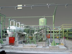写真は排ガスの脱硝用還元剤としてのアンモニアガスを脱硝設備に一定圧力で供給する装置である。受入・貯蔵設備(タンク、ローディングアーム、圧縮機)、気化・調圧設備(気化器、アキュムレータ)、除害設備(希釈槽、散水装置)で構成される。それらを一つのシステムとして制御盤にて最適制御をする。主として火力発電所向けに納入しており、近年はバイオマス発電所にも類似設備を納入している。