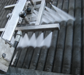 このシステムでは管束上部の位置を手で調整する必要がないため、作業が安全にできクリーニング効果も高まります。ノズルから出るフラットスプレーがフィンの損傷を防ぎます。