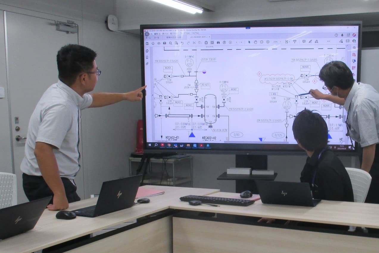 三國機械工業の社員の50%以上はエンジニアの経歴を持ち、社内にエンジニアリング事業本部を設けて、経験豊富な機械や電気のエンジニアが当社独自のプロセスエンジニアリングの提案を行っています。お客様の「やりたい事」が漠然としていても、その内容をヒアリングし、寄り添って設備計画を考えるフィージビリティ・スタディを行っています。その上で仕様や法規も考慮した最適なシステム構築と機器調達を行い、オーダーメイドの装置一式を作り上げていきます。最近は脱炭素関係のパイロットプラントを中心に、数千万円~数億円クラスのミニEPCができる稀有な会社として、水素・アンモニア・地熱・バイオマス・ガス回収・バイナリー発電などの分野で小回りの利く存在として評価されています。